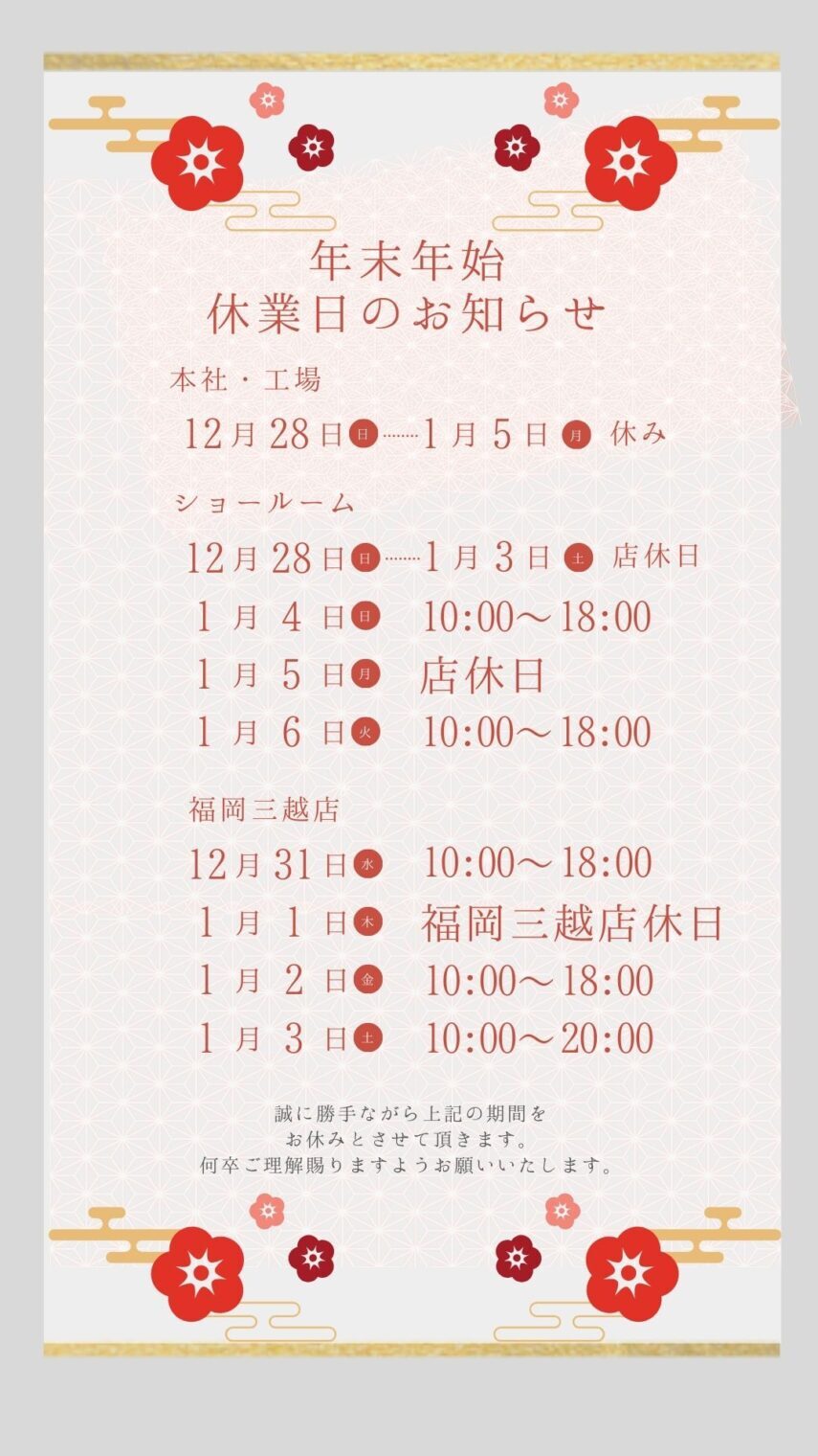 2025年12月31日(水)10:00~18:00 営業 2026年1月1日(木) 福岡三越店休日 1月2日(金) 10:00~18:00 営業 1月3日(土) 10:00~20:00 通常営業