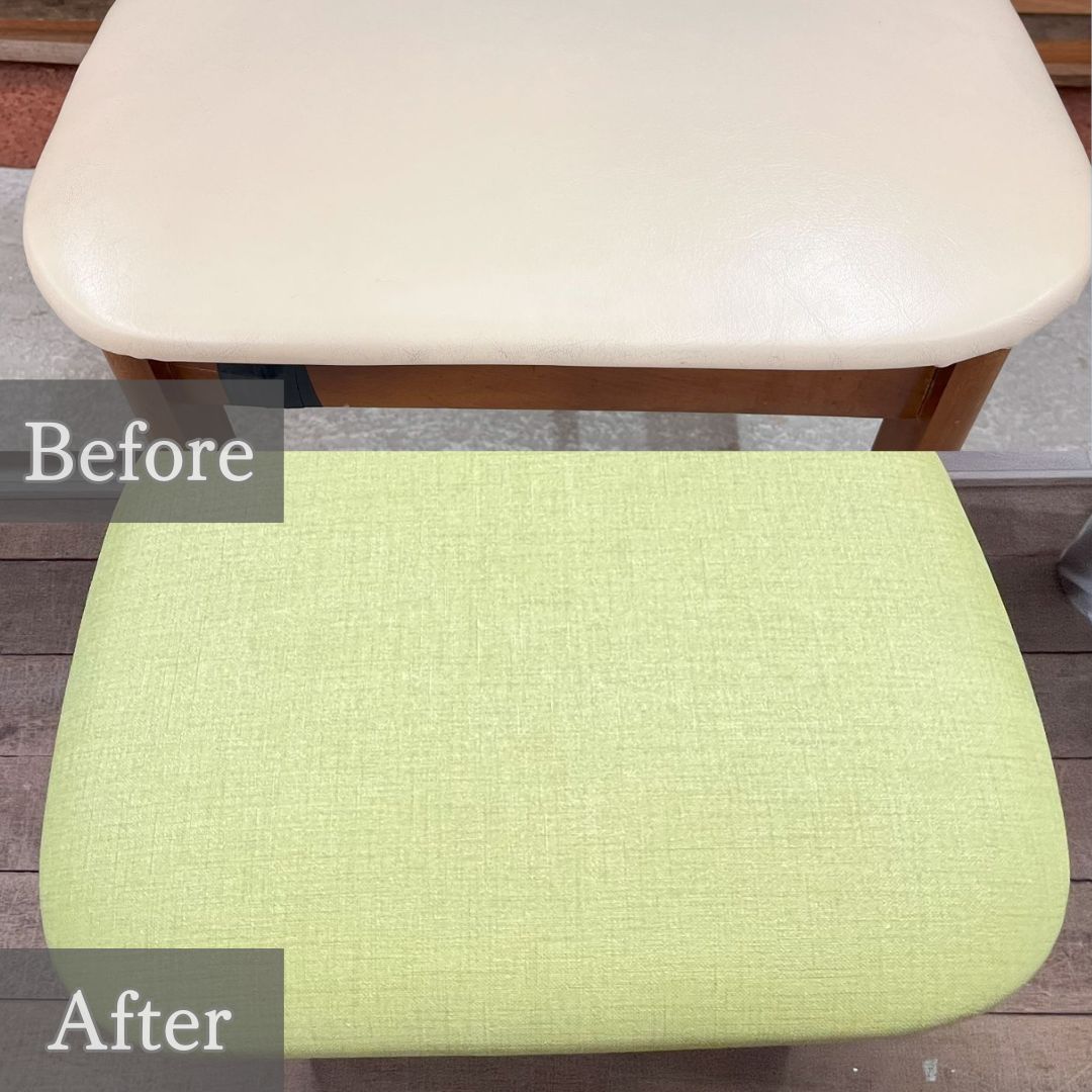 今回は他店で購入されたリビングチェア4脚の座面部分を張替えてイメチェンし、一部木枠の割れ・ぐらつきが気になる為、張替え・修繕ご希望でご来店されました。